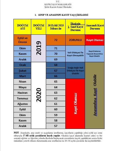 2025-2026 Eğitim Öğretim yılında ilkokula başlayacak öğrencilerin kayıt yaşı çizelgesi için tıklayınız.