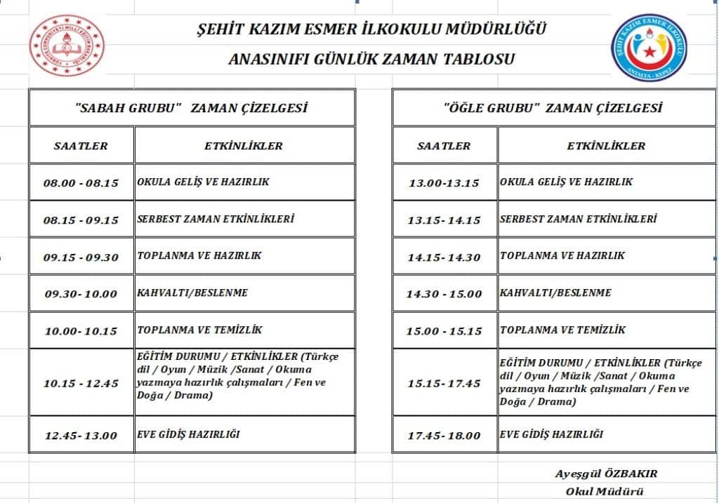 2025-2026 EĞİTİM ÖĞRETİM YILI ANASINIFI ZAMAN ÇİZELGESİ