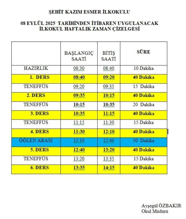 2025-2026 EĞİTİM ÖĞRETİM YILI İLKOKUL ZAMAN ÇİZELGESİ
